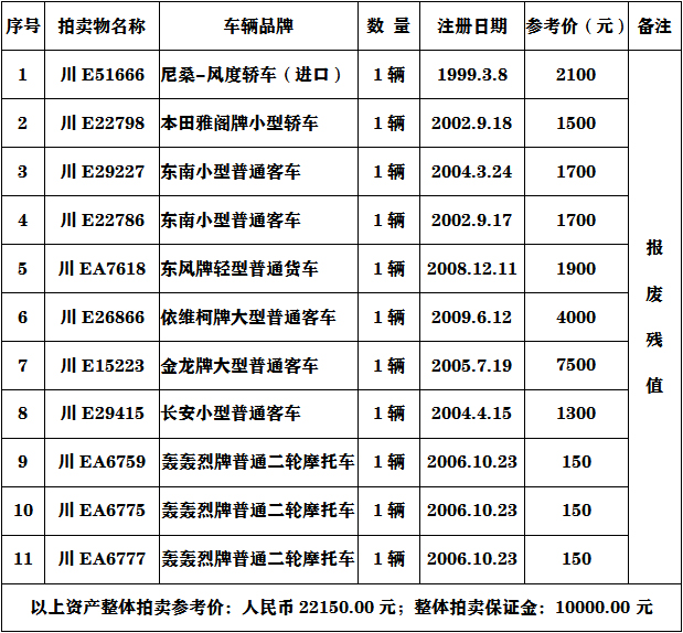 二、注意事項(xiàng):參與報(bào)廢車輛的競(jìng)買人必須具有收取報(bào)廢車輛的相關(guān)資質(zhì)。